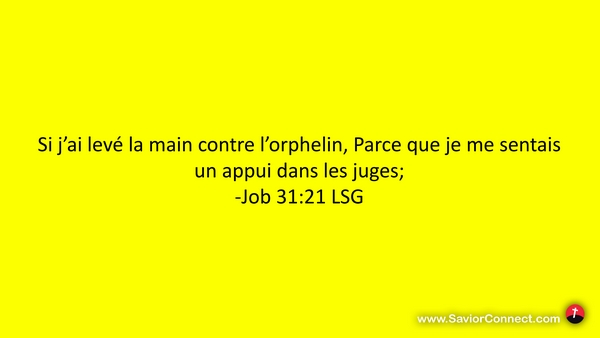 Si j'ai levé la main contre l'orphelin, Parce que je me sentais un appui dans les juges; -Job 31:21 LSG