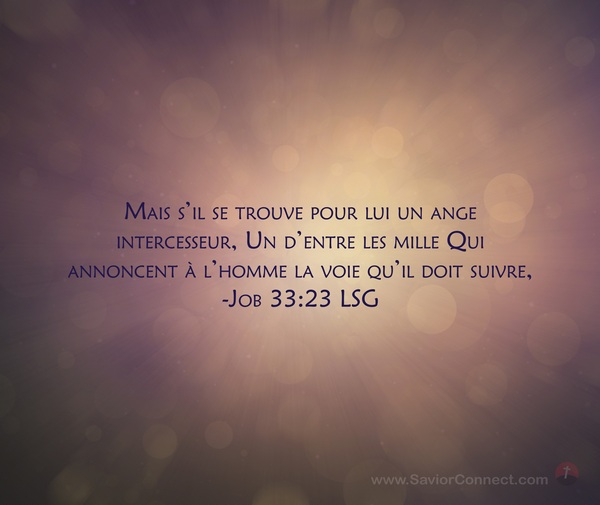 Mais s'il se trouve pour lui un ange intercesseur, Un d'entre les mille Qui annoncent à l'homme la voie qu'il doit suivre, -Job 33:23 LSG