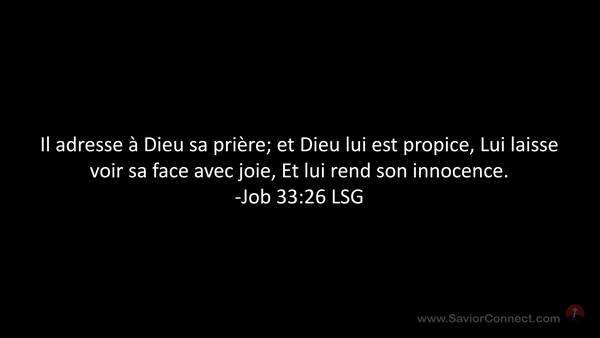 Il adresse à Dieu sa prière; et Dieu lui est propice, Lui laisse voir sa face avec joie, Et lui rend son innocence. -Job 33:26 LSG