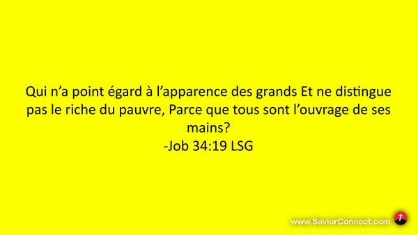 Qui n'a point égard à l'apparence des grands Et ne distingue pas le riche du pauvre, Parce que tous sont l'ouvrage de ses mains? -Job 34:19 LSG
