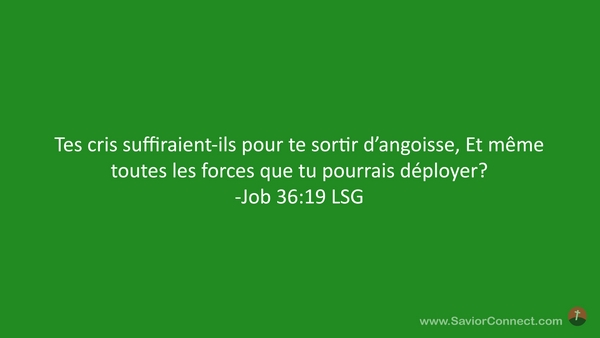 Tes cris suffiraient-ils pour te sortir d'angoisse, Et même toutes les forces que tu pourrais déployer? -Job 36:19 LSG