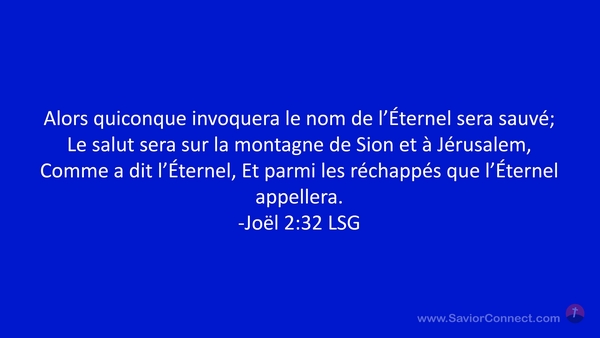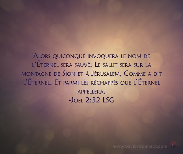Alors quiconque invoquera le nom de l'Éternel sera sauvé; Le salut sera sur la montagne de Sion et à Jérusalem, Comme a dit l'Éternel, Et parmi les réchappés que l'Éternel appellera. -Joël 2:32 LSG