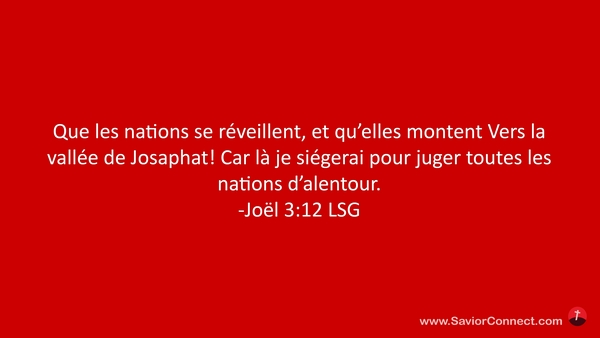 Que les nations se réveillent, et qu'elles montent Vers la vallée de Josaphat! Car là je siégerai pour juger toutes les nations d'alentour. -Joël 3:12 LSG