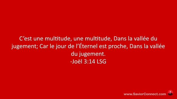 C'est une multitude, une multitude, Dans la vallée du jugement; Car le jour de l'Éternel est proche, Dans la vallée du jugement. -Joël 3:14 LSG
