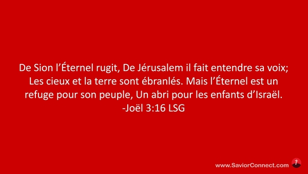De Sion l'Éternel rugit, De Jérusalem il fait entendre sa voix; Les cieux et la terre sont ébranlés. Mais l'Éternel est un refuge pour son peuple, Un abri pour les enfants d'Israël. -Joël 3:16 LSG
