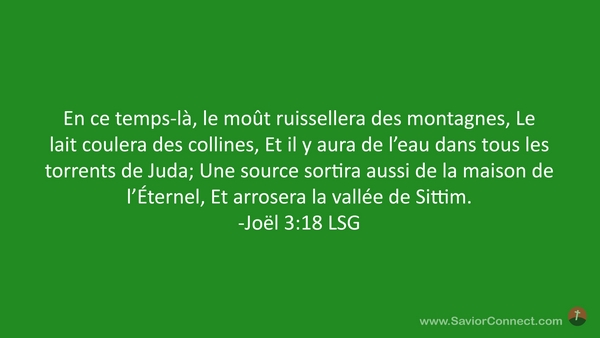 En ce temps-là, le moût ruissellera des montagnes, Le lait coulera des collines, Et il y aura de l'eau dans tous les torrents de Juda; Une source sortira aussi de la maison de l'Éternel, Et arrosera la vallée de Sittim. -Joël 3:18 LSG
