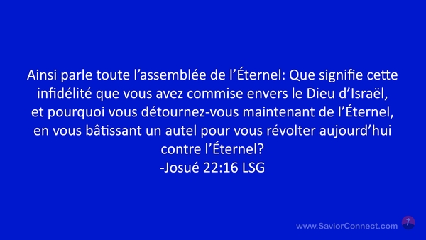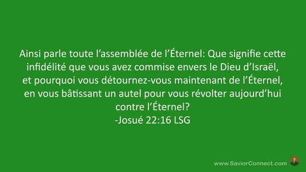 Ainsi parle toute l'assemblée de l'Éternel: Que signifie cette infidélité que vous avez commise envers le Dieu d'Israël, et pourquoi vous détournez-vous maintenant de l'Éternel, en vous bâtissant un autel pour vous révolter aujourd'hui contre l'Éternel? -Josué 22:16 LSG
