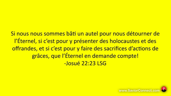 Si nous nous sommes bâti un autel pour nous détourner de l'Éternel, si c'est pour y présenter des holocaustes et des offrandes, et si c'est pour y faire des sacrifices d'actions de grâces, que l'Éternel en demande compte! -Josué 22:23 LSG