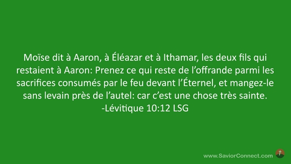 Moïse dit à Aaron, à Éléazar et à Ithamar, les deux fils qui restaient à Aaron: Prenez ce qui reste de l'offrande parmi les sacrifices consumés par le feu devant l'Éternel, et mangez-le sans levain près de l'autel: car c'est une chose très sainte. -Lévitique 10:12 LSG
