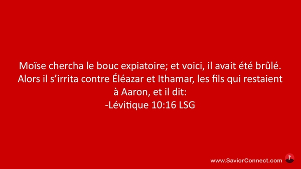 Moïse chercha le bouc expiatoire; et voici, il avait été brûlé. Alors il s'irrita contre Éléazar et Ithamar, les fils qui restaient à Aaron, et il dit: -Lévitique 10:16 LSG