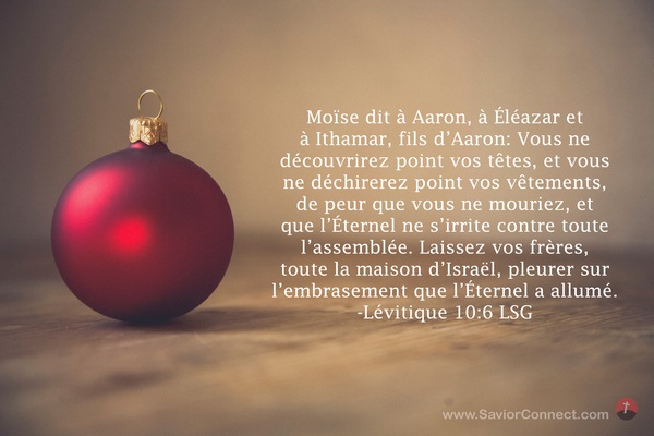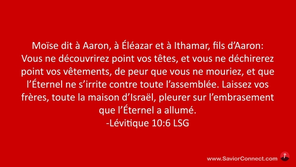 Moïse dit à Aaron, à Éléazar et à Ithamar, fils d'Aaron: Vous ne découvrirez point vos têtes, et vous ne déchirerez point vos vêtements, de peur que vous ne mouriez, et que l'Éternel ne s'irrite contre toute l'assemblée. Laissez vos frères, toute la maison d'Israël, pleurer sur l'embrasement que l'Éternel a allumé. -Lévitique 10:6 LSG