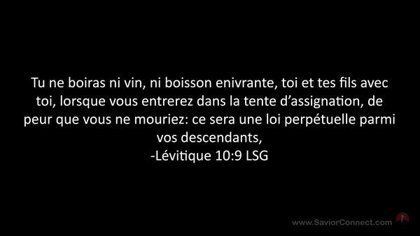 Tu ne boiras ni vin, ni boisson enivrante, toi et tes fils avec toi, lorsque vous entrerez dans la tente d'assignation, de peur que vous ne mouriez: ce sera une loi perpétuelle parmi vos descendants, -Lévitique 10:9 LSG