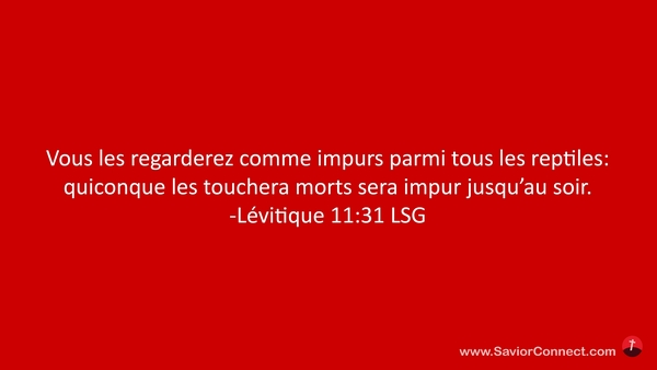 Vous les regarderez comme impurs parmi tous les reptiles: quiconque les touchera morts sera impur jusqu'au soir. -Lévitique 11:31 LSG