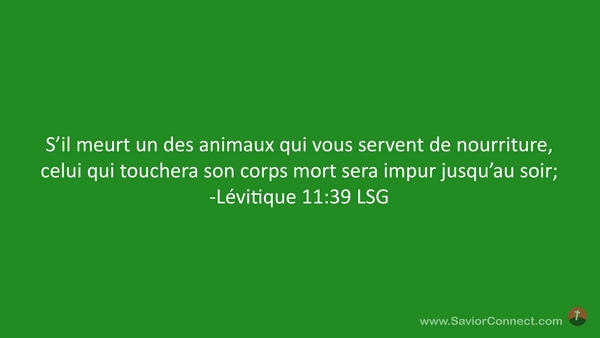 S'il meurt un des animaux qui vous servent de nourriture, celui qui touchera son corps mort sera impur jusqu'au soir; -Lévitique 11:39 LSG