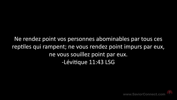 Ne rendez point vos personnes abominables par tous ces reptiles qui rampent; ne vous rendez point impurs par eux, ne vous souillez point par eux. -Lévitique 11:43 LSG