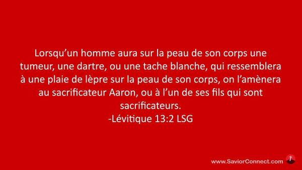 Lorsqu'un homme aura sur la peau de son corps une tumeur, une dartre, ou une tache blanche, qui ressemblera à une plaie de lèpre sur la peau de son corps, on l'amènera au sacrificateur Aaron, ou à l'un de ses fils qui sont sacrificateurs. -Lévitique 13:2 LSG