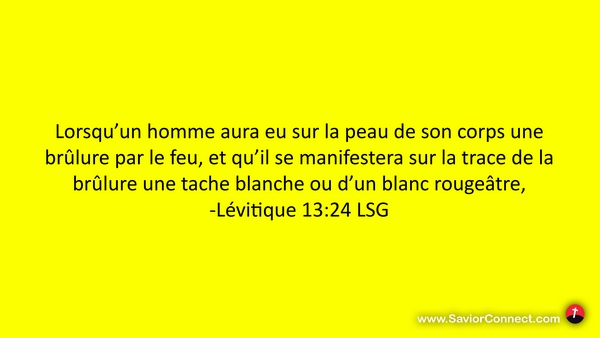 Lorsqu'un homme aura eu sur la peau de son corps une brûlure par le feu, et qu'il se manifestera sur la trace de la brûlure une tache blanche ou d'un blanc rougeâtre, -Lévitique 13:24 LSG