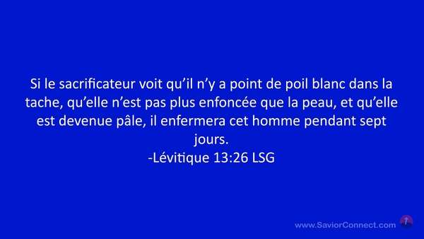Si le sacrificateur voit qu'il n'y a point de poil blanc dans la tache, qu'elle n'est pas plus enfoncée que la peau, et qu'elle est devenue pâle, il enfermera cet homme pendant sept jours. -Lévitique 13:26 LSG