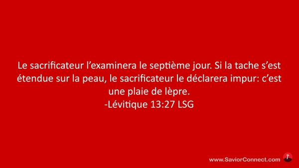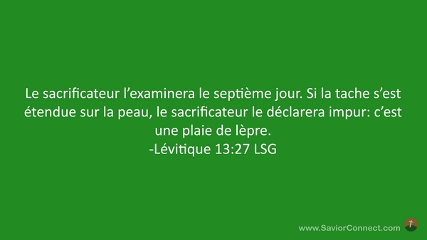 Le sacrificateur l'examinera le septième jour. Si la tache s'est étendue sur la peau, le sacrificateur le déclarera impur: c'est une plaie de lèpre. -Lévitique 13:27 LSG