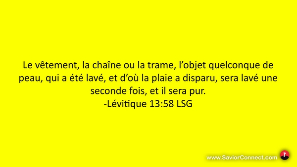 Le vêtement, la chaîne ou la trame, l'objet quelconque de peau, qui a été lavé, et d'où la plaie a disparu, sera lavé une seconde fois, et il sera pur. -Lévitique 13:58 LSG