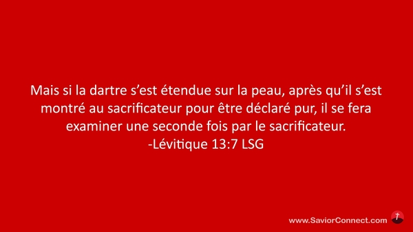 Mais si la dartre s'est étendue sur la peau, après qu'il s'est montré au sacrificateur pour être déclaré pur, il se fera examiner une seconde fois par le sacrificateur. -Lévitique 13:7 LSG