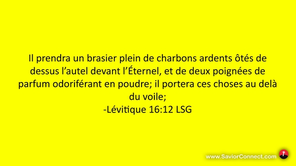 Il prendra un brasier plein de charbons ardents ôtés de dessus l'autel devant l'Éternel, et de deux poignées de parfum odoriférant en poudre; il portera ces choses au delà du voile; -Lévitique 16:12 LSG