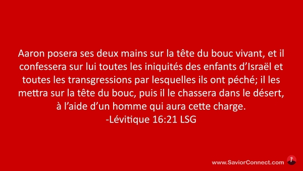 Aaron posera ses deux mains sur la tête du bouc vivant, et il confessera sur lui toutes les iniquités des enfants d'Israël et toutes les transgressions par lesquelles ils ont péché; il les mettra sur la tête du bouc, puis il le chassera dans le désert, à l'aide d'un homme qui aura cette charge. -Lévitique 16:21 LSG