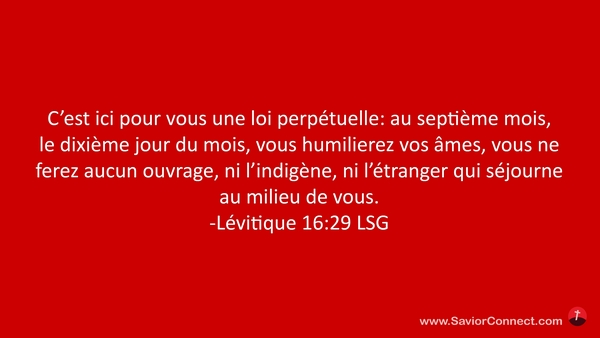 C'est ici pour vous une loi perpétuelle: au septième mois, le dixième jour du mois, vous humilierez vos âmes, vous ne ferez aucun ouvrage, ni l'indigène, ni l'étranger qui séjourne au milieu de vous. -Lévitique 16:29 LSG