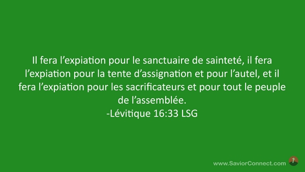 Il fera l'expiation pour le sanctuaire de sainteté, il fera l'expiation pour la tente d'assignation et pour l'autel, et il fera l'expiation pour les sacrificateurs et pour tout le peuple de l'assemblée. -Lévitique 16:33 LSG