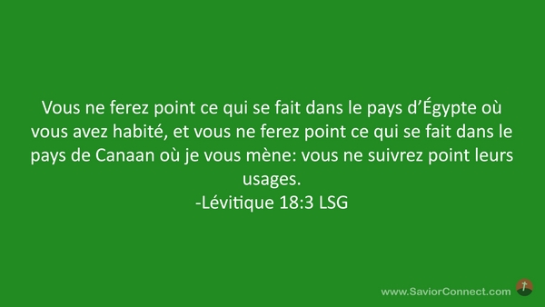 Vous ne ferez point ce qui se fait dans le pays d'Égypte où vous avez habité, et vous ne ferez point ce qui se fait dans le pays de Canaan où je vous mène: vous ne suivrez point leurs usages. -Lévitique 18:3 LSG