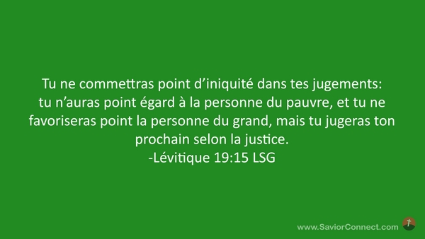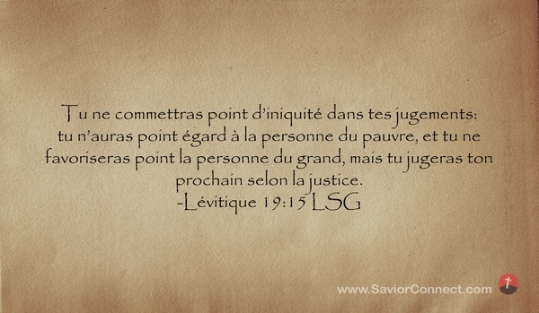 Tu ne commettras point d'iniquité dans tes jugements: tu n'auras point égard à la personne du pauvre, et tu ne favoriseras point la personne du grand, mais tu jugeras ton prochain selon la justice. -Lévitique 19:15 LSG