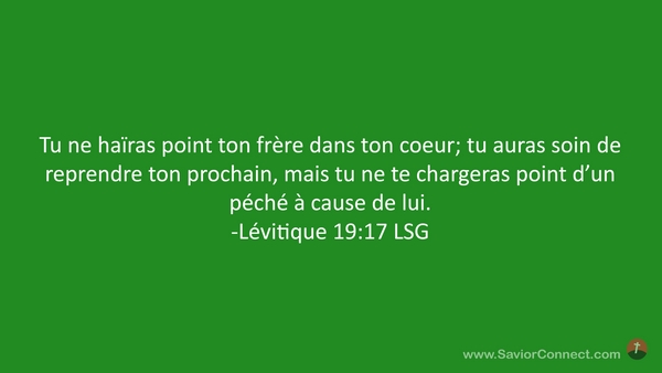 Tu ne haïras point ton frère dans ton coeur; tu auras soin de reprendre ton prochain, mais tu ne te chargeras point d'un péché à cause de lui. -Lévitique 19:17 LSG