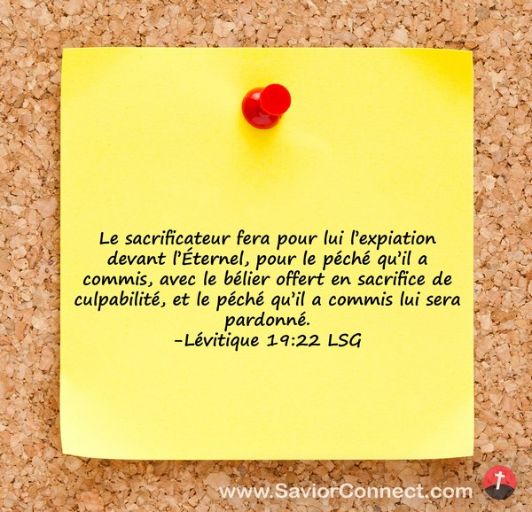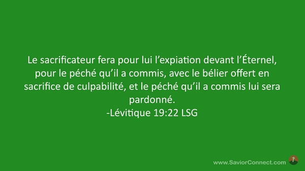 Le sacrificateur fera pour lui l'expiation devant l'Éternel, pour le péché qu'il a commis, avec le bélier offert en sacrifice de culpabilité, et le péché qu'il a commis lui sera pardonné. -Lévitique 19:22 LSG