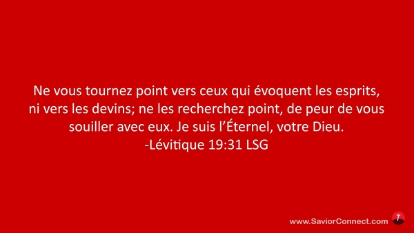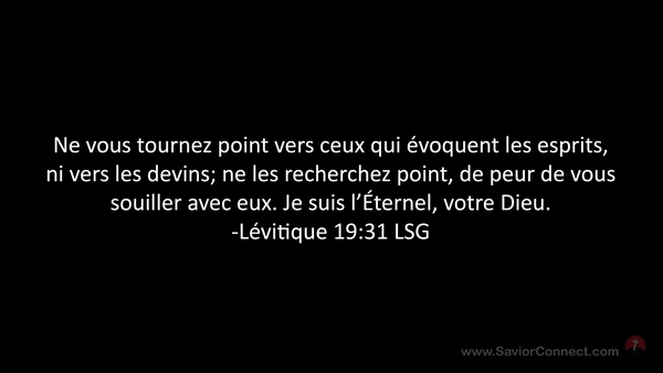Ne vous tournez point vers ceux qui évoquent les esprits, ni vers les devins; ne les recherchez point, de peur de vous souiller avec eux. Je suis l'Éternel, votre Dieu. -Lévitique 19:31 LSG