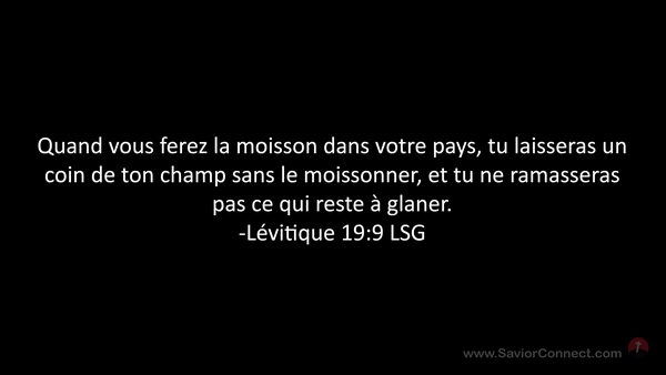 Quand vous ferez la moisson dans votre pays, tu laisseras un coin de ton champ sans le moissonner, et tu ne ramasseras pas ce qui reste à glaner. -Lévitique 19:9 LSG