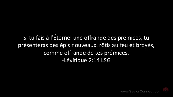 Si tu fais à l'Éternel une offrande des prémices, tu présenteras des épis nouveaux, rôtis au feu et broyés, comme offrande de tes prémices. -Lévitique 2:14 LSG
