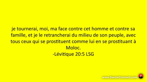 je tournerai, moi, ma face contre cet homme et contre sa famille, et je le retrancherai du milieu de son peuple, avec tous ceux qui se prostituent comme lui en se prostituant à Moloc. -Lévitique 20:5 LSG