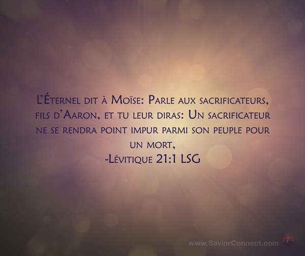 L'Éternel dit à Moïse: Parle aux sacrificateurs, fils d'Aaron, et tu leur diras: Un sacrificateur ne se rendra point impur parmi son peuple pour un mort, -Lévitique 21:1 LSG