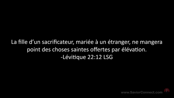 La fille d'un sacrificateur, mariée à un étranger, ne mangera point des choses saintes offertes par élévation. -Lévitique 22:12 LSG