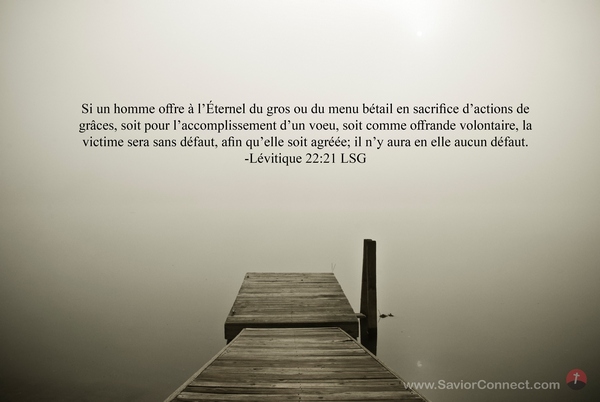 Si un homme offre à l'Éternel du gros ou du menu bétail en sacrifice d'actions de grâces, soit pour l'accomplissement d'un voeu, soit comme offrande volontaire, la victime sera sans défaut, afin qu'elle soit agréée; il n'y aura en elle aucun défaut. -Lévitique 22:21 LSG
