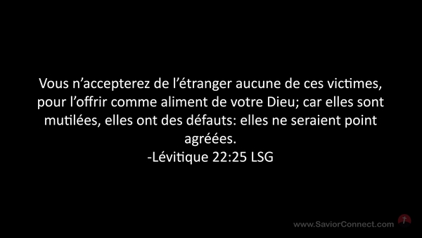 Vous n'accepterez de l'étranger aucune de ces victimes, pour l'offrir comme aliment de votre Dieu; car elles sont mutilées, elles ont des défauts: elles ne seraient point agréées. -Lévitique 22:25 LSG