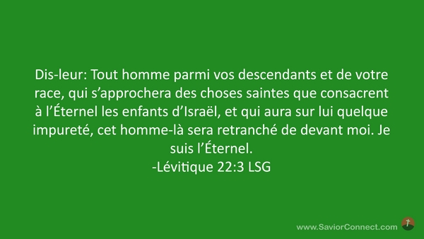 Dis-leur: Tout homme parmi vos descendants et de votre race, qui s'approchera des choses saintes que consacrent à l'Éternel les enfants d'Israël, et qui aura sur lui quelque impureté, cet homme-là sera retranché de devant moi. Je suis l'Éternel. -Lévitique 22:3 LSG