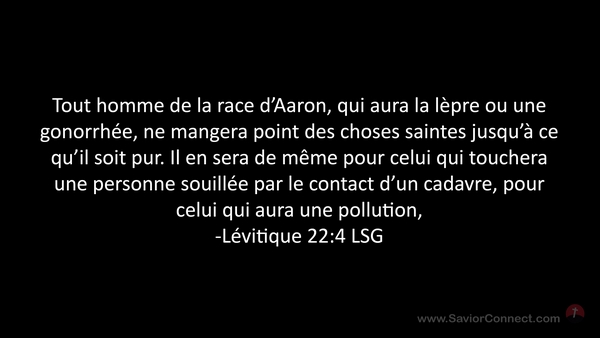 Tout homme de la race d'Aaron, qui aura la lèpre ou une gonorrhée, ne mangera point des choses saintes jusqu'à ce qu'il soit pur. Il en sera de même pour celui qui touchera une personne souillée par le contact d'un cadavre, pour celui qui aura une pollution, -Lévitique 22:4 LSG