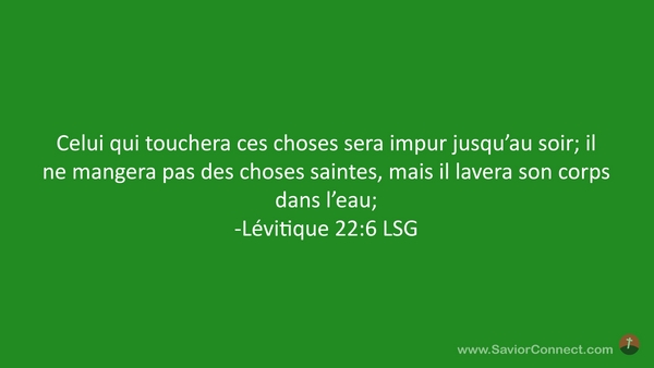 Celui qui touchera ces choses sera impur jusqu'au soir; il ne mangera pas des choses saintes, mais il lavera son corps dans l'eau; -Lévitique 22:6 LSG