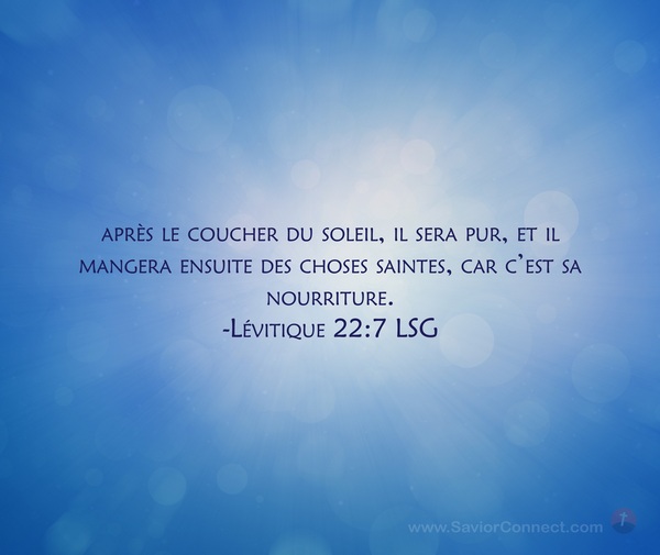 après le coucher du soleil, il sera pur, et il mangera ensuite des choses saintes, car c'est sa nourriture. -Lévitique 22:7 LSG