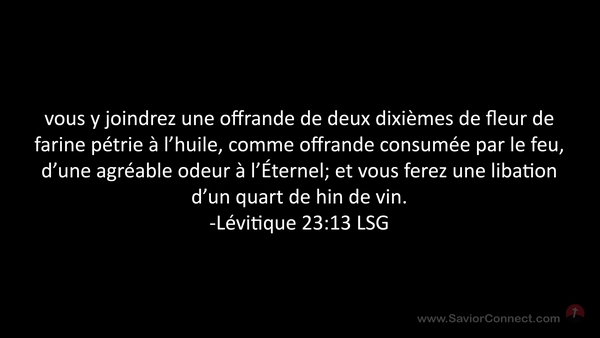 vous y joindrez une offrande de deux dixièmes de fleur de farine pétrie à l'huile, comme offrande consumée par le feu, d'une agréable odeur à l'Éternel; et vous ferez une libation d'un quart de hin de vin. -Lévitique 23:13 LSG