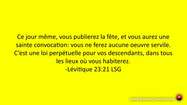 Ce jour même, vous publierez la fête, et vous aurez une sainte convocation: vous ne ferez aucune oeuvre servile. C'est une loi perpétuelle pour vos descendants, dans tous les lieux où vous habiterez. -Lévitique 23:21 LSG