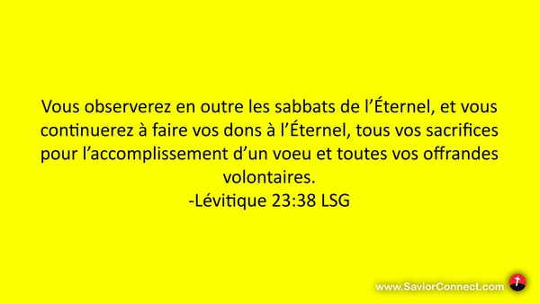 Vous observerez en outre les sabbats de l'Éternel, et vous continuerez à faire vos dons à l'Éternel, tous vos sacrifices pour l'accomplissement d'un voeu et toutes vos offrandes volontaires. -Lévitique 23:38 LSG
