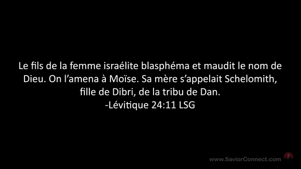 Le fils de la femme israélite blasphéma et maudit le nom de Dieu. On l'amena à Moïse. Sa mère s'appelait Schelomith, fille de Dibri, de la tribu de Dan. -Lévitique 24:11 LSG