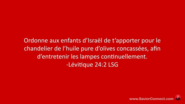 Ordonne aux enfants d'Israël de t'apporter pour le chandelier de l'huile pure d'olives concassées, afin d'entretenir les lampes continuellement. -Lévitique 24:2 LSG
